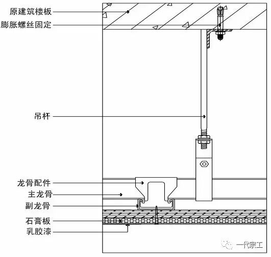 弹出天花完成面线→吊杆安装→安装主龙骨→安装沿边龙骨→安装次龙骨→龙骨调平→进行隐蔽验收→安装石膏板