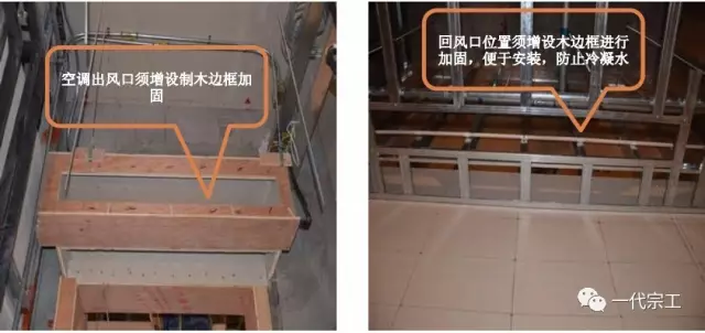 1、空调回风口、出风口、换气扇等处要求设置木边框,便于风口及设施安装以及防止冷凝水。